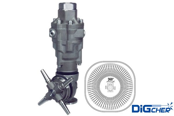 三維自動旋轉噴頭主要由不銹鋼制成,可以有效抵抗噴嘴旋轉產生的強大沖擊力。由一對錐齒輪、旋轉密封組件及液壓調速裝置等主要部件構成。進行清洗作業(yè)時,由于兩個噴管沿軸線方向具有偏心,依靠高壓水射流的反沖力使小齒輪繞著水平軸線旋轉,在經過大齒輪的嚙合作用下使旋轉密封部件沿豎直軸線旋轉。這樣就實現(xiàn)了三維旋轉清洗作業(yè)。